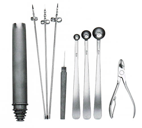 A roll-call of the items from left to right reads as follows: corers/punches, corkscrew punches (handle not shown), needle pick, melon-ball scoops, and pincers.