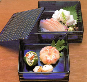 No matter what the occasion, Kyoto-style kaiseki places importance on seasonal ingredients, whose flavor is to be enhanced gently, never to be overwhelmed by heavy spices or elaborate sauces. It is intended to be served graciously, enjoyed leisurely, and appreciated attentively. (Today, a kaiseki meal can be extremely costly, but it is an experience that does not have to be missed. For a person on a limited budget, a kaiseki bento, the "box lunch" supreme, will provide a delightful sampler of this magnificent cuisine.)