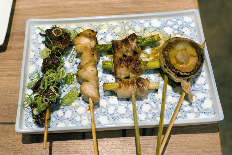 Tempting skewers of grilled meats and vegetables - often smothered in cheese or paired with bacon - are the draw at this very casual yakitori shop. Popular favorites include grilled camembert cheese wedges, shiitake mushrooms with butter-soy sauce, "kujo negi" Kyoto green onions with cheese, and bacon-wrapped asparagus spears. They also do a good job with more standard skewers like chicken thigh meat, tender beef skirt steak and fatty chicken tail.