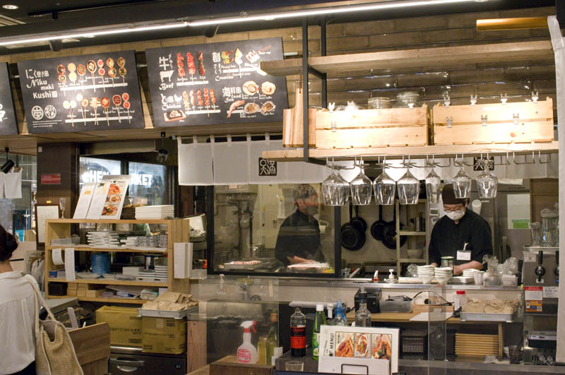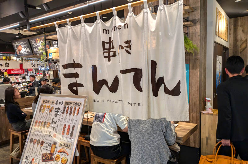 Budget-friendly wines, fruit-based liqueurs and beer are among the drink options. There's a small table charge, which gets you a paper bag filled with edamame. The shop is located in the basement of Osaka Station's Lucua mall, convenient for grabbing a beer and a few skewers before catching a train.
