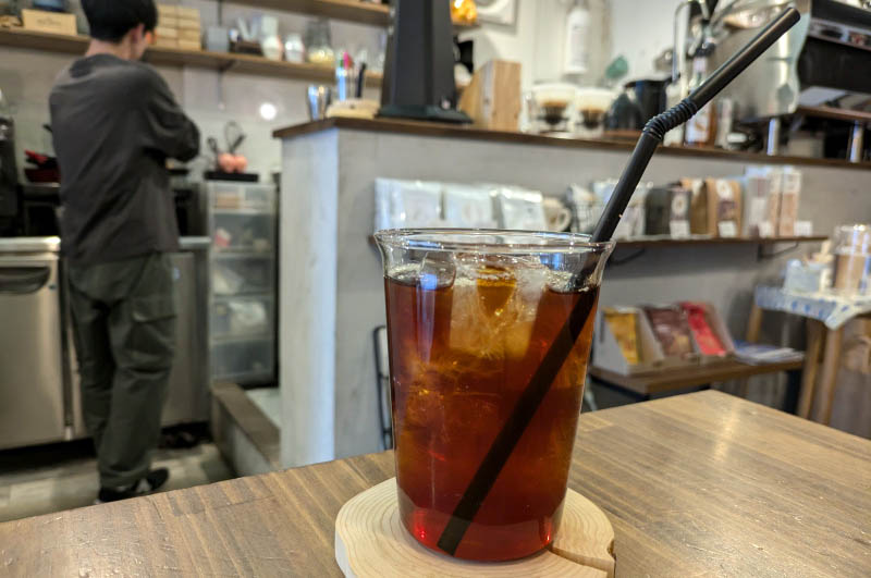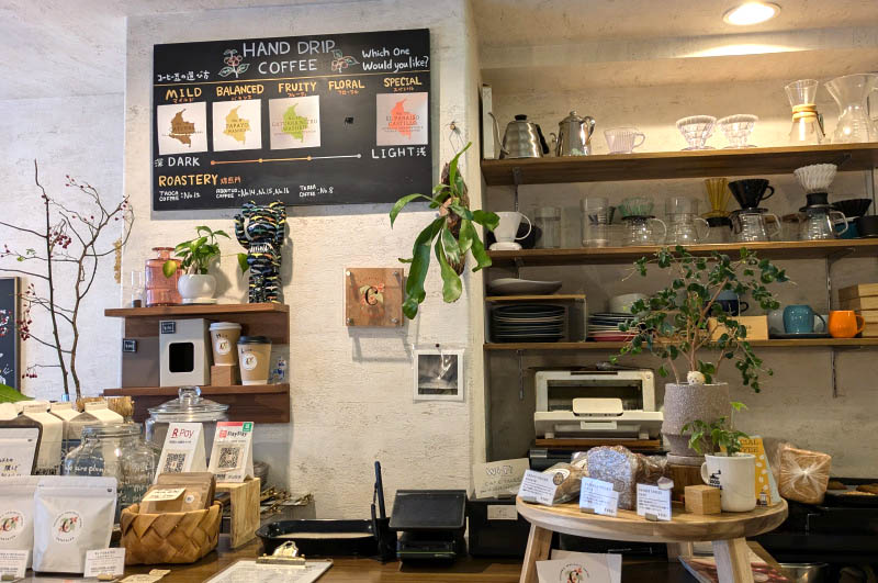 The cafe is furnished with five small tables, plus a bench on the sidewalk in front. Coffee starts at under Y600 per cup, though some special rare beans are more expensive.