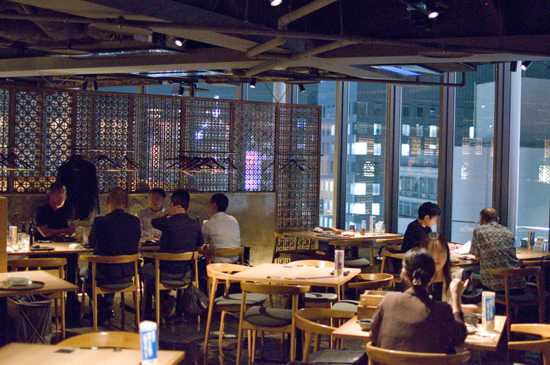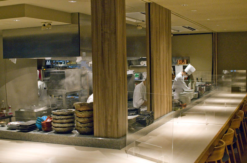 Starting at the dramatically lit entrance, diners here walk through a succession of visually distinct spaces - there's a partially screened off bar area to the right of the entrance pathway, then further along is a room full of dimly lit tables arranged to take advantage of the 10th-floor view over central Kobe. Then there's a small area of zashiki seating along the far glass wall. To the left is a huge, warmly lit L-shaped counter that's instantly recognizable as the heart of the place, providing a balance for the hard design edges and adding a warmer, human element. Large earthenware pots and sprawling arrangements of dried flowers and branches also serve to set off the different spaces, and reinforce the earth-toned color scheme.