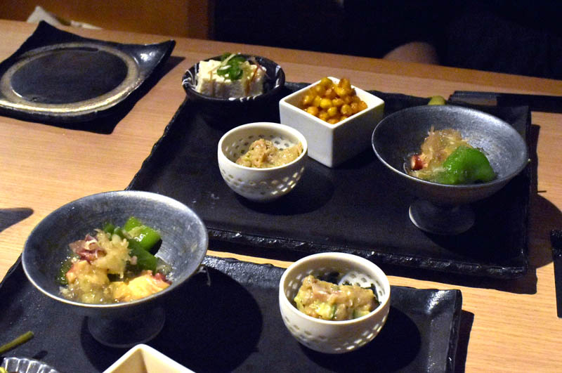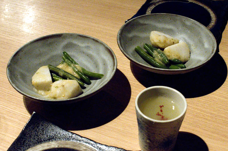 One interesting regional item is the grilled eel sushi, prepared in the Kansai style by pressing the fish topping over rice in a rectangular box, then cutting it into rectangular pieces. Kobe is also famous for its Chinatown neighborhood, and another locally influenced dish is the excellent assorted dim sum platter. This is definitely a cross-cultural interpretation of dim sum - the dipping sauce has a distinctive yuzu component, and one of the dim sum varieties looks like a typical crab ball but seems to be made from polenta instead. Another dumpling is filled with delicate slivers of various seafood ingredients along with tiny green peas.