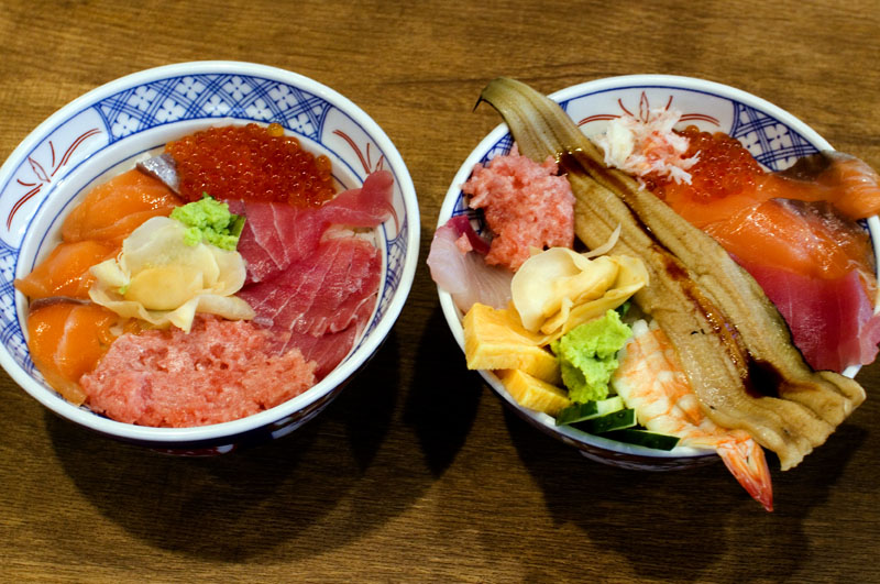 The lunchtime menu (served 11am-5pm) offers particularly good value for money, with nineteen very attractive seafood donburi options. If you're extra hungry you can add on side dishes like negitoro and potato salad. Prices are only a bit higher in the evening, but the menu expands quite a bit. Specialties of the house include clams, scallops and other shellfish grilled in their shells, plus a large selection of sashimi platters.