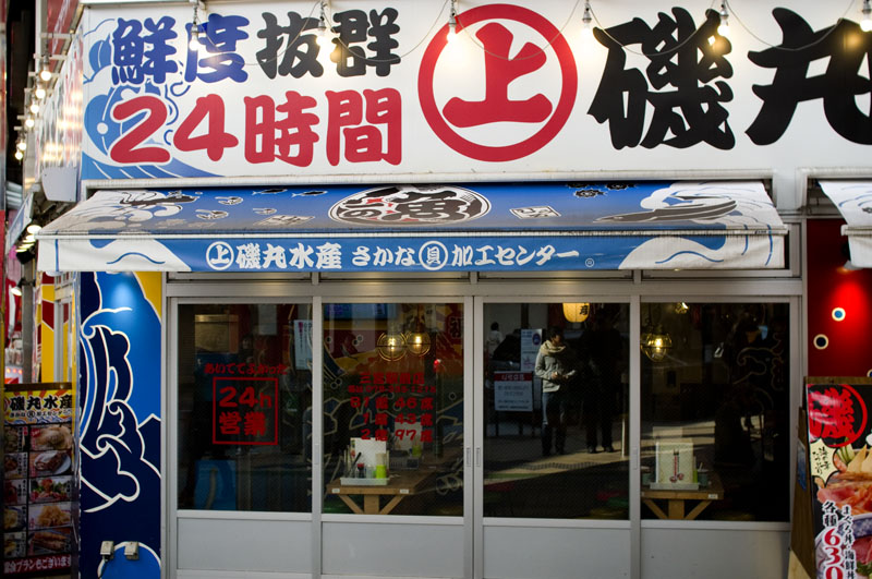 Open 24 hours a day, this fish-specialty izakaya offers a wide range of raw and grilled fish and simple seafood dishes along with locally produced sake and inexpensive cocktails. The decor is Showa-era retro-nostalgic, with paper lanterns and old-fashioned wooden sign boards, while 1960s and 1970s J-pop plays in the background.