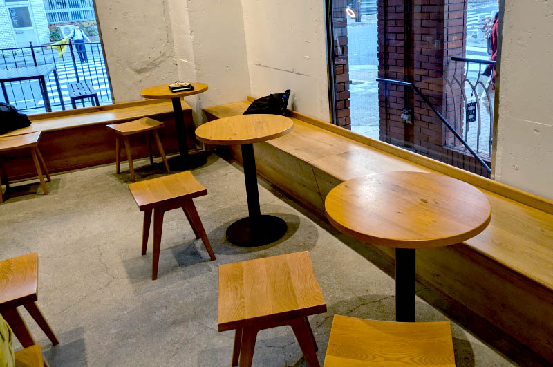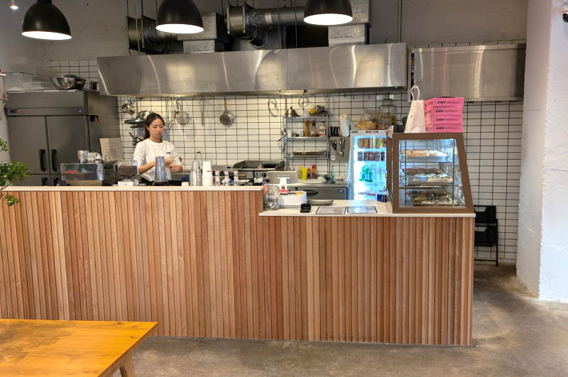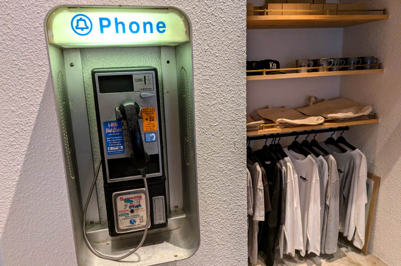 The background music is energetic and fun, and the spacious seating area is stylishly minimalist, with odd touches like an American payphone mounted on the wall next to a small rack of clothes.