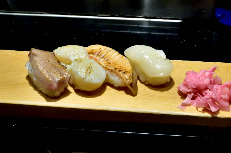 Most sushi is ordered by the pair, but they also put together three-piece "sets" showcasing for example three varieties of tuna or three kinds of seared fish, and these are worth checking out. Drinks include several wines by the glass as well as beer and sake.