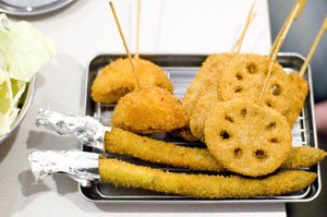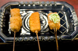 This popular Osaka-based izakaya is the complete opposite of your typical Tokyo gourmet kushiage shop - the atmosphere is lively and often raucous, with every inch of the tightly packed tables crowded to overflowing with trays of food and drinks. And, true to their Osaka roots, prices are very reasonable - most deep-fried skewers are Y100-120 each, with luxury items like asparagus and....