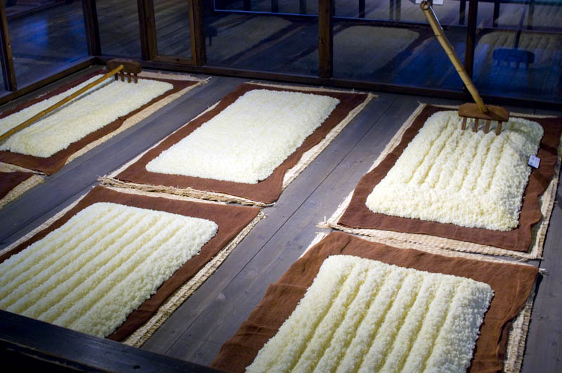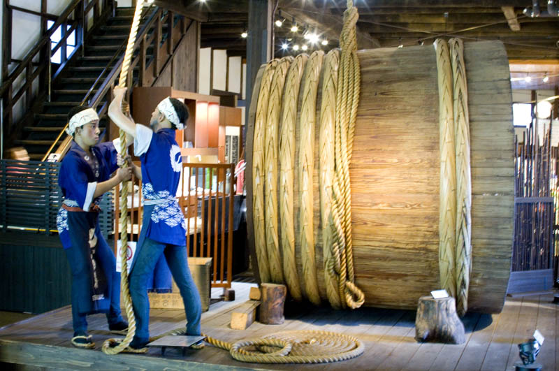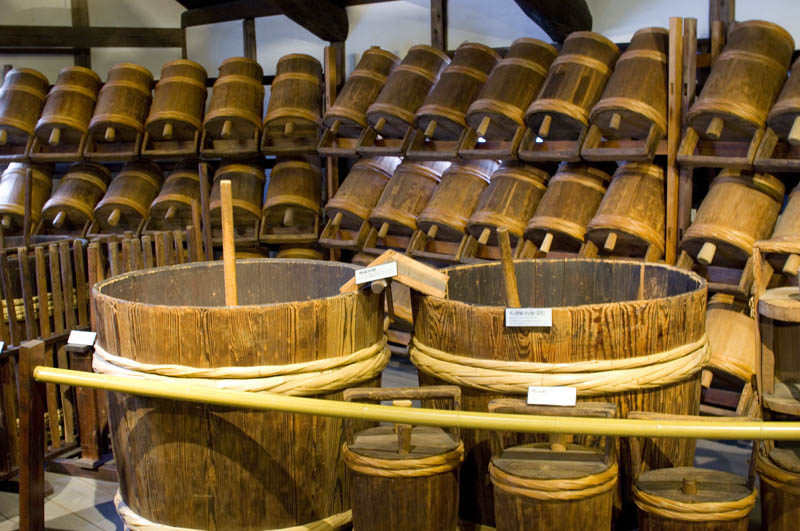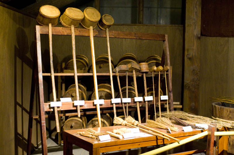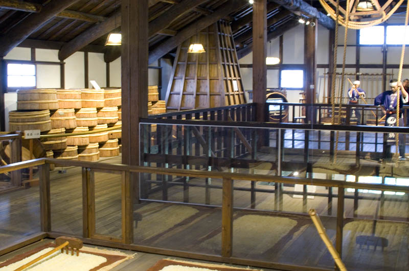 This brewery museum is one of the most interesting of the many sake attractions in Kobe's compact brewery district. It's actually been put together inside an old sake kura, so unlike a modern museum it really smells like old wood and straw. There are life-size mannequins throughout the big two-story structure, caught in the act of inspecting the mash or stirring the yeast or performing any of the other many sake-making steps that are explained in great detail.