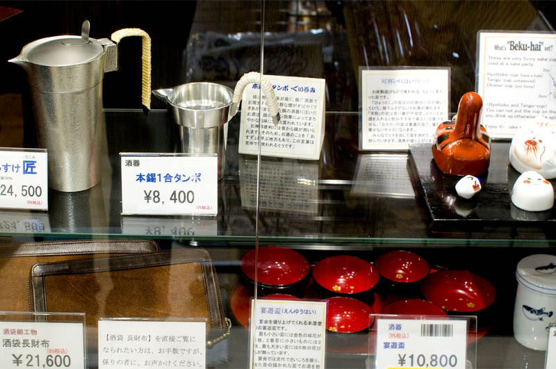 The enormous museum shop carries many varieties of Kikumasamune sake, pickles and other sake-drinking snacks, and various sake-related cosmetic products. There's also a good selection of sake cups, flasks and lacquerware masu (boxes) for your home sake-drinking needs. And in the tasting corner of the shop you can try three or four different types of Kikumasamune sake, including one variety that's not nationally distributed, but only available in local Kobe restaurants.