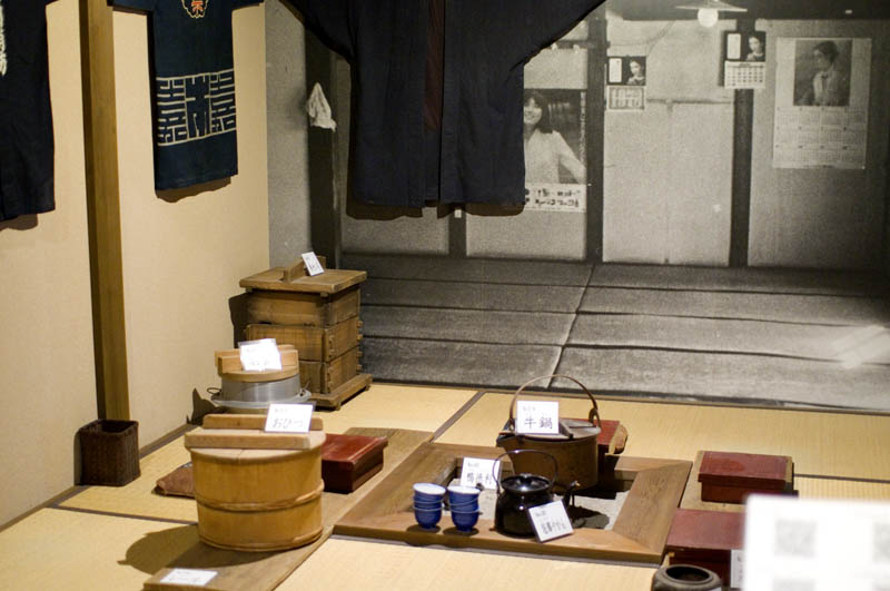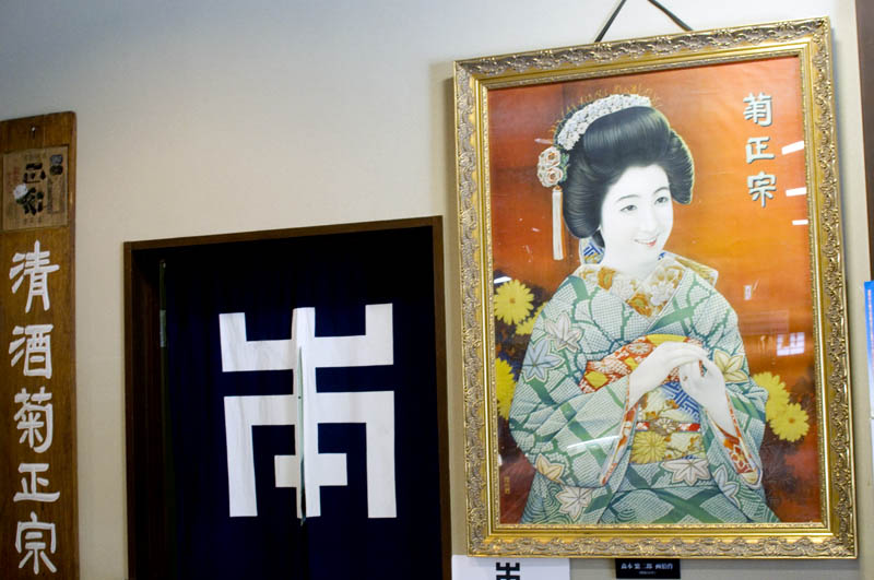 Out in the front yard there's a small traditional rice-polishing mill, powered by a working waterwheel. Once you're inside the museum, the entrance hall displays scale models of tradtional brewery buildings as well as old sake advertising posters.