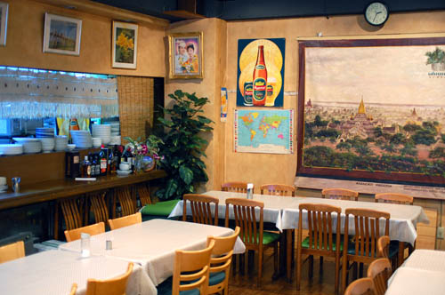Mingalaba is fairly spacious, with a standard decor of plain tables, bright lighting and video monitor mounted high in a corner. It seems to attract families and those looking for a simple evening meal. The Japanese menu is fairly complete, and the staff is eager to offer advice on what to order. Like Nagani nearby, Mingalaba gets a lot of non-Burmese customers.
