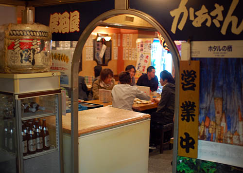 Who can resist a restaurant called "Mom's", especially when the kitchen and waitress staff is a squadron of fifty-ish, motherly types who look like they'd be disappointed in you for not finishing your vegetables. But the main draw here is the sake -- they promise a "journey through Japan by sake", and they stock close to 100 brands, from every part of the country, with most varieties running Y500-Y800 per glass. There's also a respectable menu of izakaya-style food, with grilled chicken wings, duck steak, and plenty of seasonal items. No English.