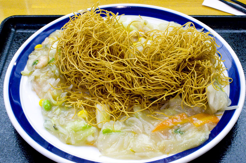 This budget chain serves two kinds of Nagasaki-style noodles - sara-udon (crisp fried ramen noodles topped with vegetables, pork and seafood in a thick sauce), and Nagasaki champon (similar to the above but in a pork-based soup). Side dishes include gyoza dumplings (regular, cheese, and mentaiko-cheese) and fried rice.