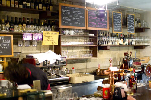 The stand-up bar at the front of Il Bacaro has a nice casual feel to it. You can drop in for a few minutes, have a quick glass of wine and a tiny snack, and be on your way. Or you can claim a seat at one of the three small tables and linger awhile, directing your attention to some of the dozen or so wines served by the glass. Cold appetizer trays line the counter, an espresso machine grinds away in the background, and dancehall reggae or pop music plays on the stereo. Waiters from the main dining room come and go with drink orders, and customers drift in and out. Snatches of Italian can be heard from time to time.