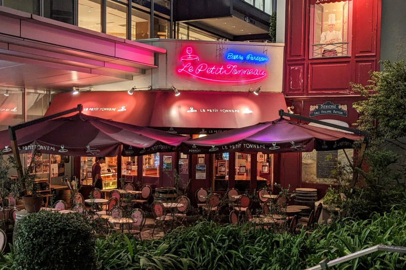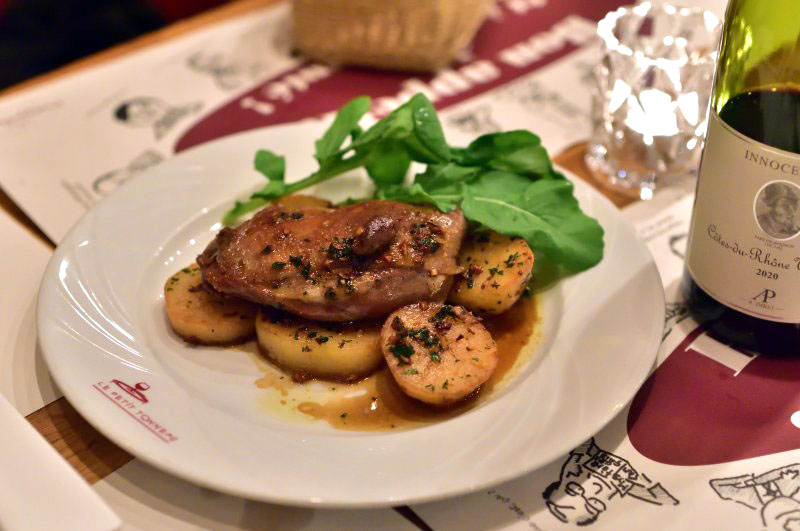 Le Petit Tonneau's food menu features hearty fare like Bouillabaisse, Braised Beef Cheek in Red Wine, and classic Steak Frites. The duck confit is done to perfection (with very crisp skin and moist meat that falls away from the bone) and it's served with world-class fried potatoes (soft enough to melt in the mouth). There's a superb, down-home-style stewed lamb with white beans that goes very well with the excellent Cotes de Rhone Villages wine. Even something as simple as the endive salad is prepared lovingly, with bits of herbs, crisp bacon and crunchy croutons.