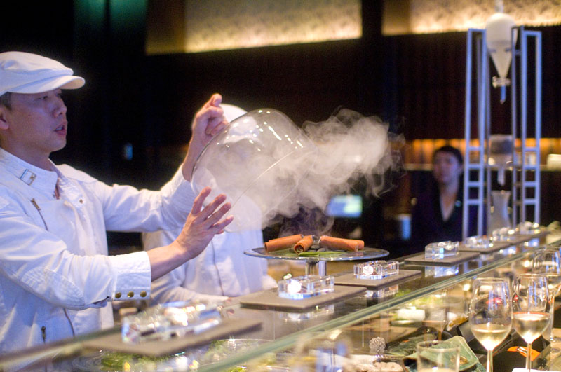 Here inside the Mandarin Hotel's 38th-floor lounge, the seven-seat Tapas Molecular Bar serves cutting-edge modern cuisine. Twenty-one plates of highly inventive, deconstructivist, very tasty morsels are presented over the course of two hours (Y29,095).