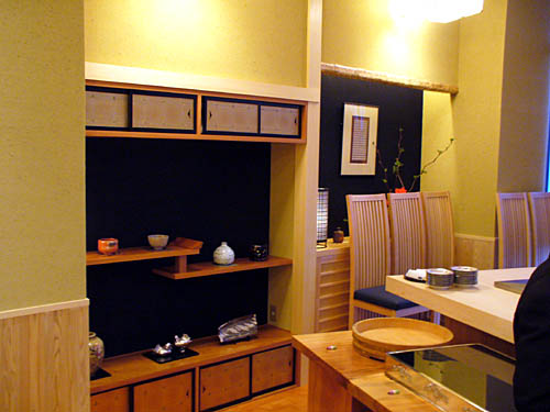 Lunch starts at Y2625 (ebi tendon), with full-course lunches from Y5250 and dinners from Y9450. Five wines are served by the glass, and bottles are priced from Y6300.