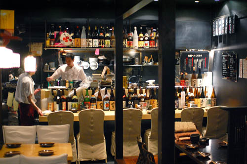 During a recent visit some menu highlights were the spicy cucumber and bean-sprout starter, skewers of perfectly grilled pork belly, kushiage-style quail eggs and asparagus, and Okinawan champuru stir-fry, a hefty portion which included big tender chunks of chicken mixed in with the tofu and goya. We received sound advice on sake choices throughout the evening, and were pleasantly surprised by a nicely priced Juyondai that wasn't even on the menu. Budget around Y4000-5000 for dinner and drinks.