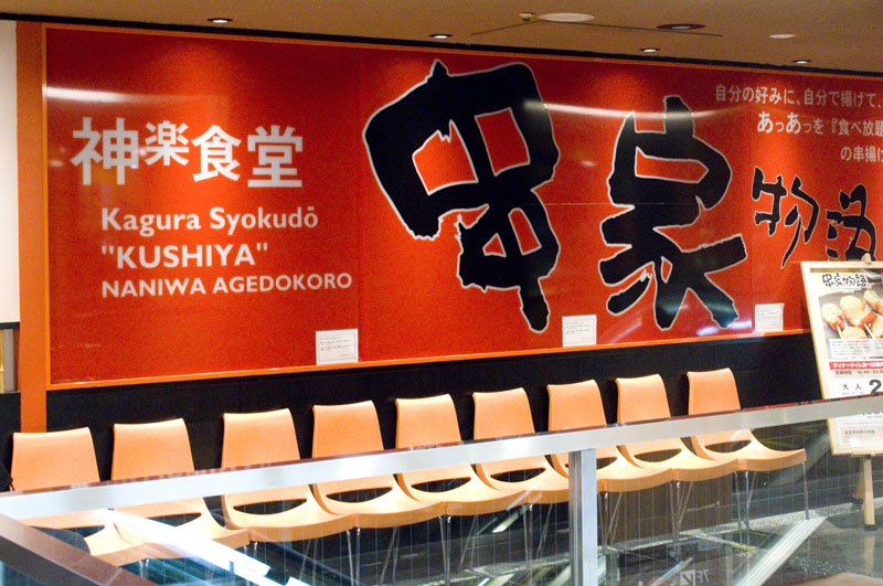 Good, all-you-can-eat kushiage from this very popular Osaka-based chain. Pick your own skewers of fish, meat and vegetables from the counter and deep-fry them yourself at your table. Y2500 for two hours. There are also inexpensive all-you-can-drink plans to go with your meal.
