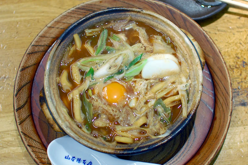 Yamamotoya is one of the best-known purveyors of miso-nikomi udon, flat udon noodles prepared in a miso-rich, bonito-based soup. The noodles are thick and chewy, and the soup is filled with fish cakes, leeks, egg, and many optional ingredients such as Nagoya cochin chicken.
