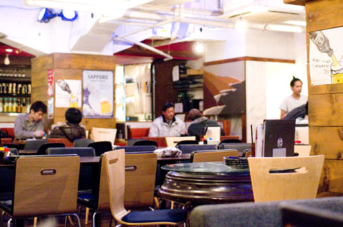 The food is fairly decent and good value for money, with some nice bargain surprises like the very good cabbage with spicy miso dip (Y280). In addition to yakitori there's a selection of filling nabe stews, starting at Y924 per person, sashimi, and other izakaya standards. The grilled pork is one of our favorites here, and the chicken breast with wasabi is consistently good.