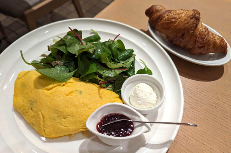 Among the numerous egg-based offerings are a hearty Farmer's Omelette - stuffed with ham, potatoes and leeks - and a high-protein Spinach and Goat Cheese Omelette made with only egg whites. The "Half and Half Eggs Benedict" comes with dual toppings of ham and smoked salmon (the latter of which is also called Eggs Royale). Rocket and other accompanying greens are nicely seasoned and come in ample portions.