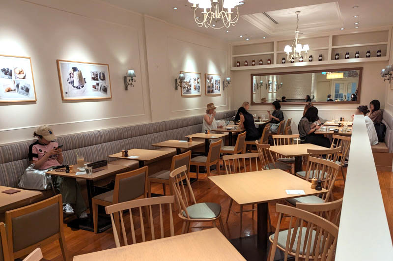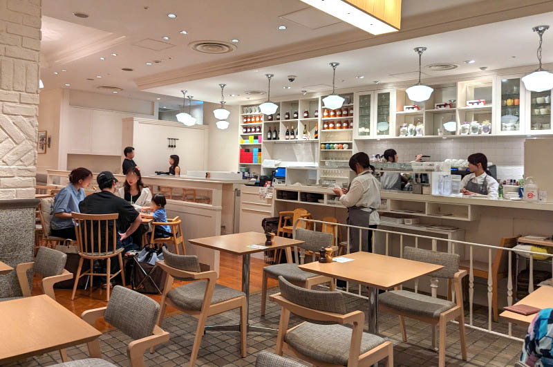 The dining room is a bright and cheerful cafe-style setup, with a lively daytime atmosphere. Sarabeth's is conveniently located just an escalator ride away from the busy South Gate of JR Shinjuku Station.
