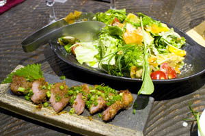 Food here tilted heavily toward sake-friendly items, such as the six kinds of yaki-miso (we were especially taken by the grilled garlic miso) and a very tasty miso-marinated griilled pork. There are also some very nice salads and a handful of grilled fish and sashimi items. Our grilled ray was sweeter and more tender than average, but still had a pleasant crunch.