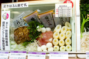 An impressive selection of local Akita Prefecture sake is the main reason to visit this crowded retail shop, one of a dozen antenna shops located in the same building. They also sell ready-made kits for preparing kiritambo - a type of nabe stew famous in the region - as well as rice and rice cakes, chicken meatballs, pear and grape juices, natto, pickles, honey, miso and black garlic.