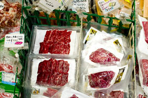 Local food and drink from Kumamoto Prefecture are sold here, and highlights include frozen horsemeat sashimi (Y580 for 70g); fresh ginger, yams and kabosu; and a good assortment of shochu, including small-size bottles. Upstairs is the Asobi Bar, a pleasant bar area where you can sample various types of shochu along with regional snacks. (Bar open 5-8pm; last order 7:30pm; closed most Sundays and Mondays.)