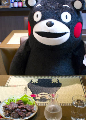 We enjoyed a hefty plate of peppery charcoal-grilled horsemeat (very tender and flavorful) and yamauni-dofu, tofu that's been marinated in miso, resulting in a rich, sweet concentrated flavor that goes well with sake or shochu. Beside the restaurant is a small shop selling various non-food products, including character goods in the image of Kumamoto's famous mascot bear, Kumamon.