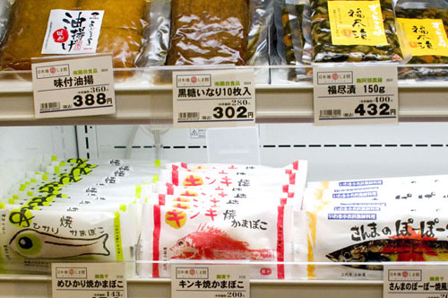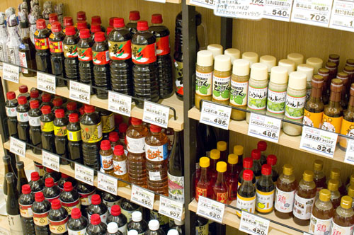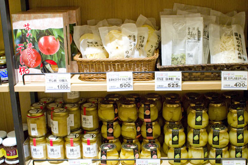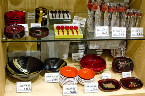 Near the tasting counter is a well-stocked sake retail area, with more than 100 sake by the bottle, many of them otherwise hard to find in Tokyo. There's also a good assortment of food - fresh produce; fruit jams and preserves; many types of miso and soy sauce; soba, udon and rice noodles; twelve kinds of packaged curry; kamaboko fish cakes; pickles and ice cream. The crafts area of the shop handles tableware, glassware, wooden dolls and other decorative items.