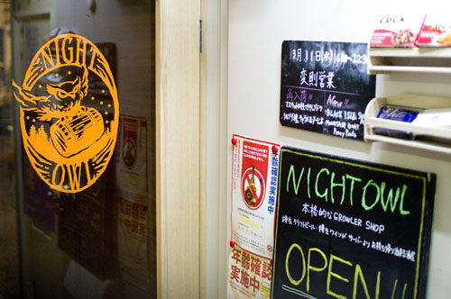 On the retail side Night Owl carries a limited selection of obscure beers that are hard to find elsewhere - Moa from New Zealand and Mountain Goat from Australia among them - mostly priced at over Y1,000 for a small bottle. You can also find artisanal bitters, various absinthes, expensive chocolates and other gourmet foods. Note that in spite of the name, Night Owl closes at 9pm (8pm on weekends).