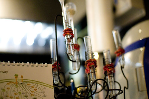It's like a party in a chemistry lab every night at Science Bar Incubator. Drinks are served in beakers and erlenmeyer flasks, food is heated on wire-mesh stands over alcohol lamps, and customers can change into white lab coats for the duration of their visit. A tasting flight of red wine in a test-tube rack makes a cute photo op, as does the biology-lab microscope that's set up at one end of the bar.