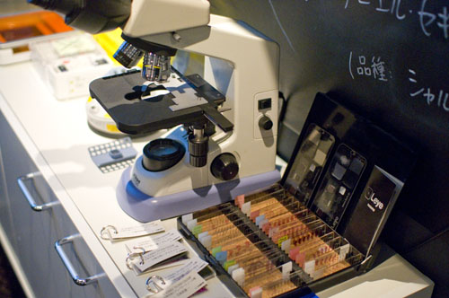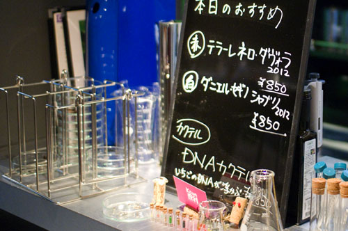 Incubator's Y500 cover charge includes a snack (we were served several figs in a big test tube) and optional use of a lab coat. After that drinks are priced fairly normally - for example wine by the glass starts at Y750 and a 300ml Pyrex beaker of beer is Y900. The food menu features items like oysters, tofu and tomato salad with avocado oil, and cheese fondue heated over a lamp.