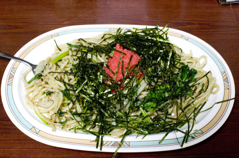 The spartan lunch-counter decor looks like it hasn't been updated since the 1960s, and the food is similarly retro - Japanese-style spaghetti served with plastic tubs of potato salad as a side order. The mentaiko spaghetti is a heap of thick, soft-cooked pasta livened up with shiso leaves, shiitake, onions, nori and komatsuna greens nicely balancing the spicy cod roe.