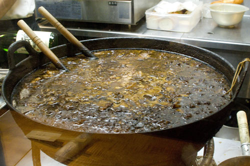 The rich, fatty stew is served in clay pots along with garlic toast, a perfect combination. It makes an excellent starter while you're waiting for your grilled pork, which is also some of the best in town. Like most yakiton shops, pork organ meats are a highlight of the menu, with nearly a dozen to choose from. Our favorites here were the pork tongue and the kashira (cheek meat), grilled over charcoal with just the right amount of charring.