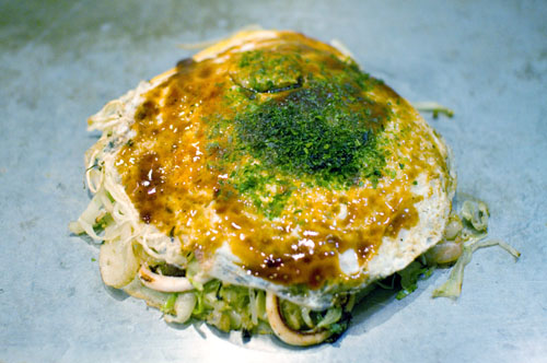 Hiroshima-style okonomiyaki is the specialty at this friendly neighborhood spot, along with a good assortment of vegetables from the teppanyaki grill. Choose from seven or eight okonomiyaki variations, all made with a base of pork, eggs, cabbage and other vegetables, plus your choice of ramen (aka "soba") or udon noodles. (In case you're extra-hungry, we were told that the ramen noodles create a more voluminous final product.)