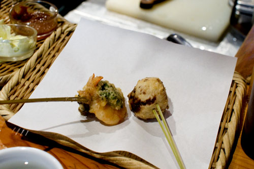During a recent visit these featured some unusual items like sukiyaki-flavored tofu dumplings, cream cheese with takuan pickles and nori, and chrysanthemum greens with ground pork. Other highlights included the excellent home-made bacon, chicken meat paired with very tender chunks of gobo, and octopus in miso. The first round of five skewers will run Y1200 per person, and after that it's Y580 for each additional set of three skewers.
