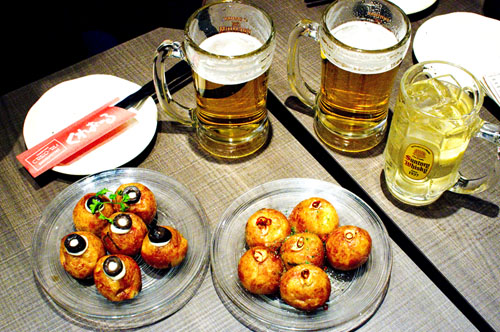 Also featured on the menu are "Osaka-style drinks," which in this case means frozen plum liquor and various highball cocktails as well as red and white wines. Menus are bilingual.