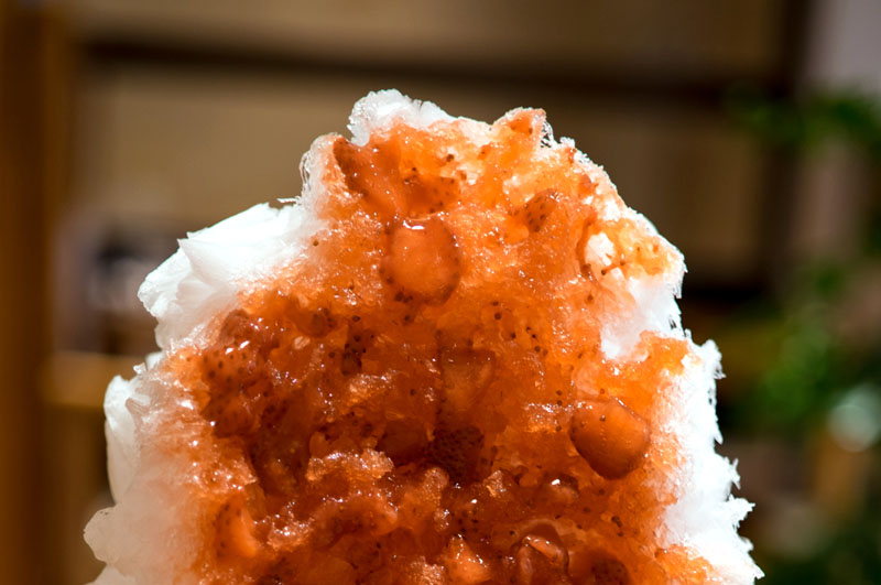 The kakigori at Shimura can be ordered on the second floor, above the traditional sweets shop that has been in the area for many, many years. Their kakigori menu features all the usual suspects, with the fresh strawberry being the most popular. Be sure to order it made with natural spring water from Yatsugatake in the Southern Alps of Japan. For only an extra Y100, you get some of the cleanest water in the country. The strawberries are only slightly sweetened, meaning this massive serving of kakigori is surprisingly easy to eat.