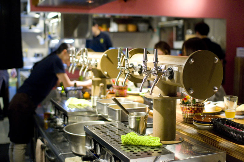 Upstairs on the second floor of the brewery is a large dining area where you can sample some of the dozens of beers made here along with beer-friendly food. Eight beers on tap are priced at around Y950 and Y650 for large and small sizes, and during a recent visit these included four different IPAs, a stout, a lager, an altbier and a grape ale.