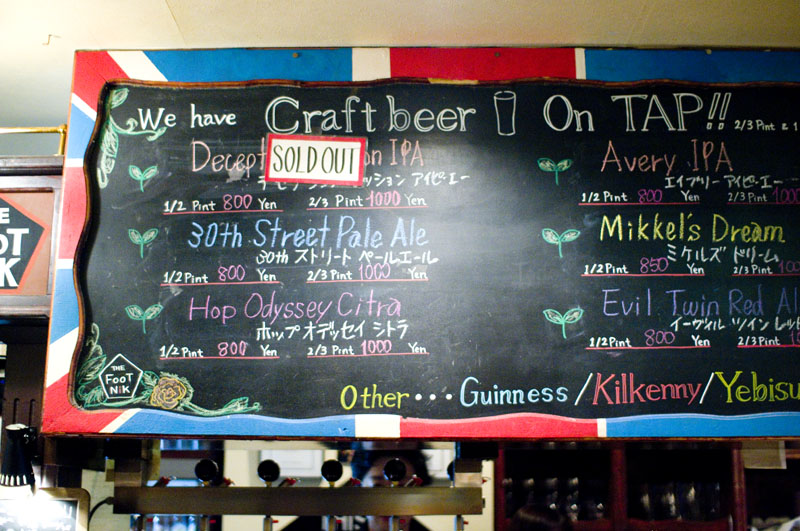 Not just for football fans, this British pub serves a half dozen craft beers on tap, from breweries like Avery, Green Flash and Evil Twin, along with the usual Kilkenny and Yebisu. A 2/3 pint glass will set you back around Y1000. Football matches and other sporting events are shown on the big screen TV.