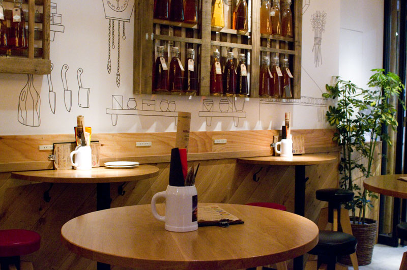 The extensive food menu offers pizzas, pastas and risotti, a tempting range of sausages (lamb, herb, currywurst), meat dishes (schnitzel, charcuterie platter), and even some German vegetable dishes. The dining room is very casual, with most seating at high tables with stools, although there are a few proper dining tables in back. A mix of contemporary German pop music plays in the background.
