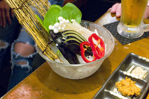 The otoshi here is an attractively arranged icy bowl of eringi mushrooms and assorted crisp raw vegetables, with miso, mayo and flavored salt for dipping. The daily seafood specials are always a good place to start, and we can recommend the deep-fried kibinago (silver-stripe herring), the flying fish and other assorted fish cakes, and the daily sashimi platter.