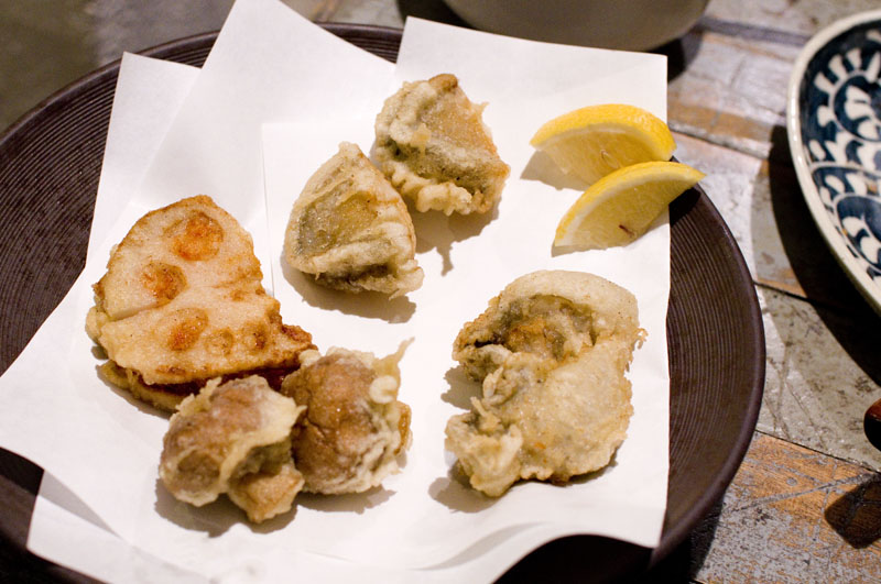 The food menu focuses on tempura, a dish more often found in brightly lit traditional counter shops rather than more casual settings like this. Basic skewers such as prawns, anago eel and vegetables are priced at Y150-200, supplemented by more deluxe, original items like coriander prawn kakiage. The breading is light, and the fresh, clean flavors of the ingredients come shining through.