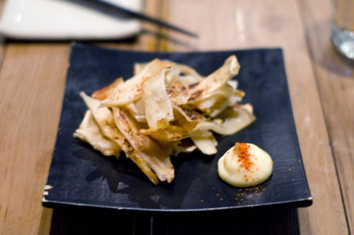The food menu may look quite ordinary at first glance, but the kitchen adds its own personal touch to typical izakaya fare. The eihire (ray fins), for example, are softer, thicker and meatier than expected, and come with a nice garlic-infused mayonnaise. The excellent potato salad is livened up with a good dose of vinegar and bits of raw onion, served with a soft-boiled egg on top. And the menchi katsu is one of the most unusual versions we've run across, with a meat filling that's dark and quite strongly flavored, encased in a thin, crunchy shell.
