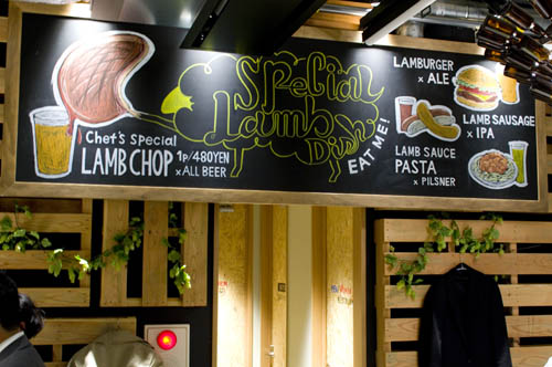 One thing we like about this craft-beer bar chain, besides the reasonable prices and broad beer selection, is that fact that each branch has its own distinctive food menu. The theme here at CBM's tenth branch is lamb, and the kitchen goes all out with nearly a dozen lamb-centered dishes including their specialty of the house - bite-size grilled lamb chops for just Y480 apiece.