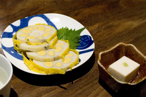 Lotus-root (renkon) delicacies are the unusual specialty at this old-fashioned izakaya, along with a more familiar menu of grilled chicken, creative small plates, and turtle (suppon) dishes. The restaurant occupies a converted residential-style building in the midst of Ueno's commercial shopping zone, with comfortable booths downstairs and tatami (hori-kotatsu) seating on the second floor.